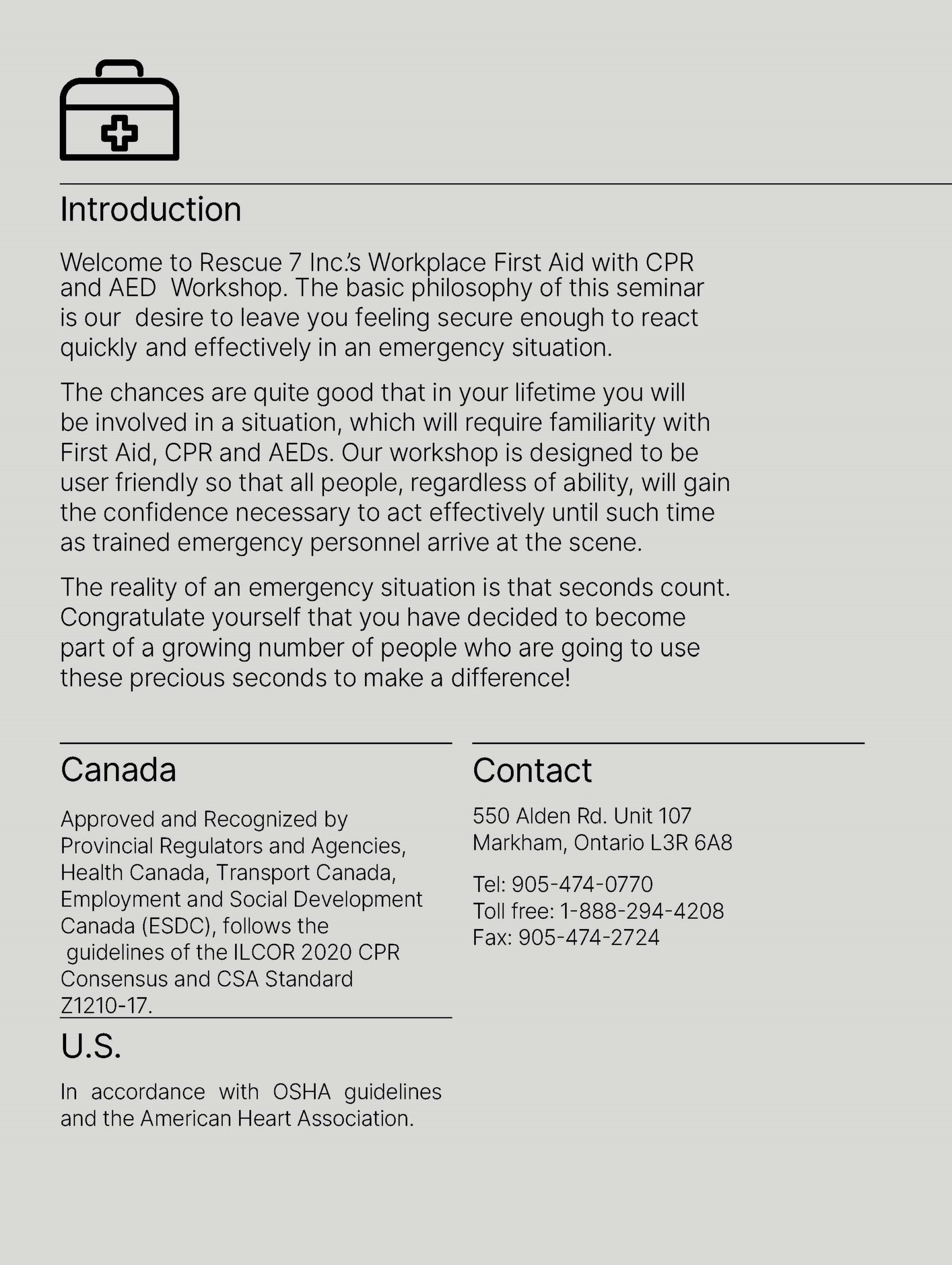 Rescue 7 Inc.'s CSA Workplace First Aid, CPR, and AED ePUB is ideal for use within training courses designed to certify individuals in first aid, CPR, and AED. More than a stand-alone text, this student manual is the center of an integrated teaching and learning system that offers many resources to better support instructors and prepare students to learn life-saving skills.